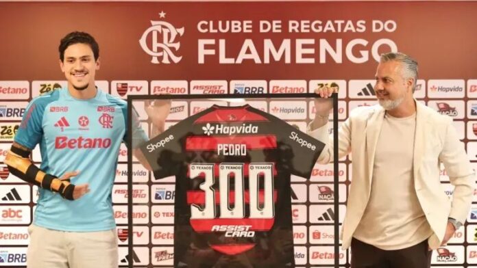 Em recuperação de uma fratura no braço direito, Pedro foi homenageado nesta segunda (3), no Ninho do Urubu, pela marca de 300 jogos com a camisa do Flamengo. O atacante celebrou a marca e projetou conquistar mais títulos pelo clube ainda em 2025.